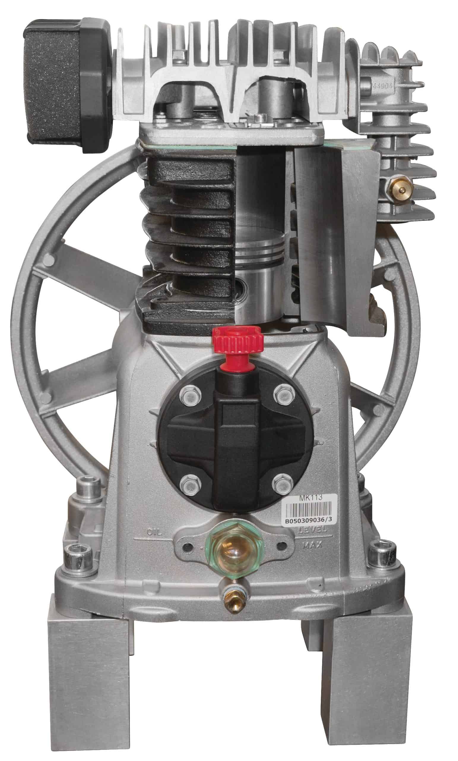 - Das große Lüfterrad und ein Kühlluftleitblech am Zylinder sorgen für optimale Kühlung des Verdichters
