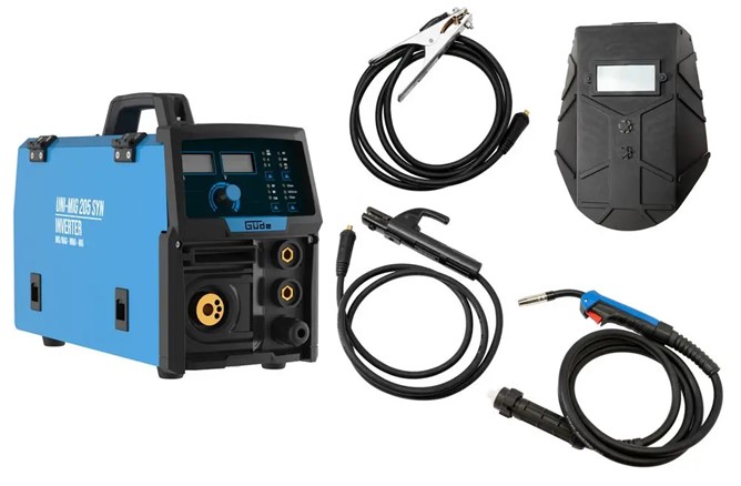 Das Uni-Mig 205 SYN gehört zu den Universalgeräten der Inverterschweissgeräte in der Güde-Produktlinie. Mit dem Uni-Mig 205 SYN sind praktisch alle 4 Schweißverfahren möglich, MIG-MAG, MMA (Elektrodenschweißen), Flux (Fülldrahtschweißen) und schließlich WIG-Schweißen (optional). IGBT unterstützte Inverter-Technology für extrem schnelle Schaltprozesse und präziser Schweißstrom-regulierung, die das Schweißen von dünneren Blechen vereinfacht und die Schweißperlenbildung deutlich reduziert. Die bewährten Zusatzeigenschaften wie Anti-Stick, Hot Start und Arc Force, sorgen für höchsten Schweißkomfort, auch unter schwierigen Bedingungen. Der neue, innovative, synergic-geregelte Drahtvorschub stellt sich, nach Auswahl von Schweißverfahren, Drahtstärke und Schweißstärke, automatisch auf die passende Geschwindigkeit ein. Vor allem auch Einsteigern und noch ungeübten Schweißern ermöglichen diese Zusatzfunktionen, sofort gute Schweißergebnisse. Elektrodenhalter und Masseklemme, sowie das Schweißschild und der Bürstenhammer, für MMA-Prozesse sind selbstverständlich serienmäßig im Lieferumfang enthalten. Gleiches gilt natürlich für den MIG-MAG-Brenner und den Druckregler für das Schutzgas. Der ebenfalls im Lieferumfang enthaltene Schweißwagen sorgt für Ordnung und größtmögliche Mobilität.
